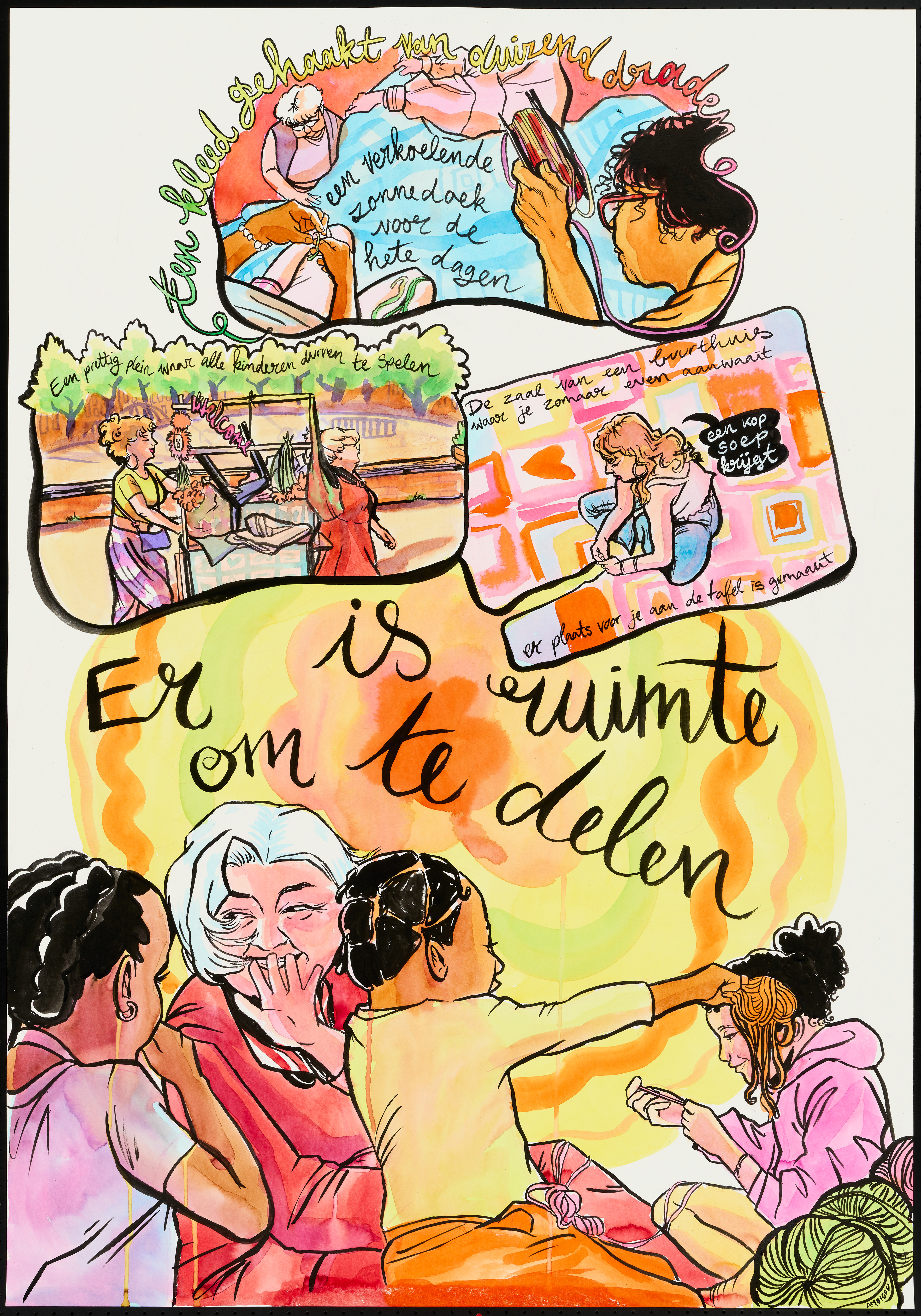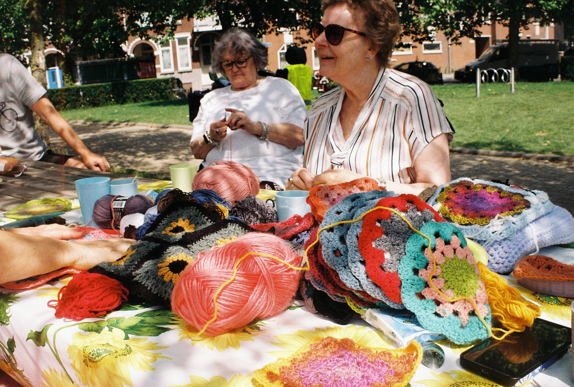 Samen met vooral ouderen maken ze een groot zonnedoek. Er wordt gehaakt, koffie gedronken en gepraat.